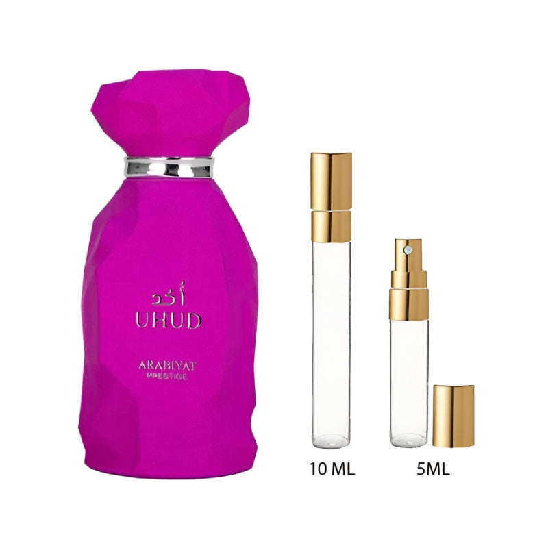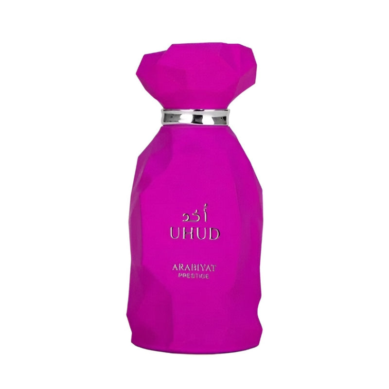 Uhud de Arabiyat Prestige es una fragancia oriental vainilla unisex, dulce y envolvente, inspirada en la calidez de una noche en el desierto. Creada por Silvia Martinelli, combina notas gourmand con la sensualidad del almizcle.